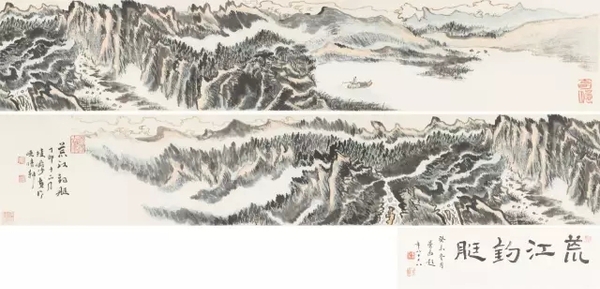 陆俨少 荒江钓艇 纸本手卷 尺寸:引首:23×76.5cm;本幅:23×210cm 备注:沙曼翁题引首。