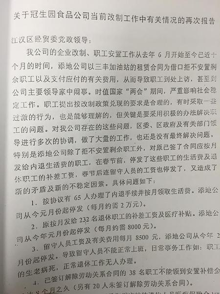 冠生园现法人代表唐星说:“十几年来,安置职工花了一千多万。主要靠上级部门调拨,都是这借点,那借点,要解决问题啊。老厂的土地和房产都已经过户(给添地公司)了,没有任何收益?!?/p>