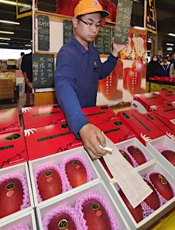 当地时间早晨7点,开拍钟声鸣响。在此起彼伏的叫价声中,熟透的红色芒果陆续成交。以最高价拍下芒果的宫崎市中间商立本昭太(32岁)笑着说:“今年也会把宫崎芒果带给全国的人们?!?/p>