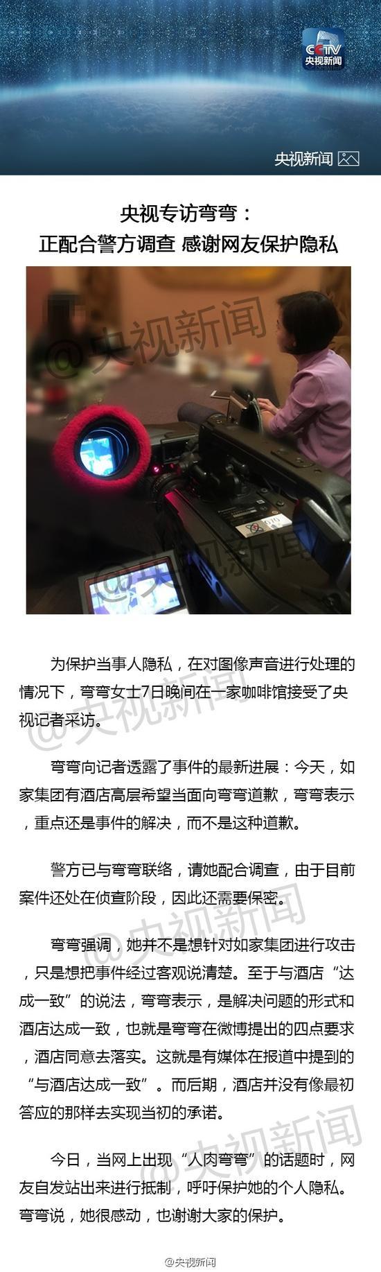 弯弯今晚(7日)接受央视专访,表示接受采访并不是想攻击如家,只想客观说清事件经过。警方已与其联络,请她配合调查。今日网上出现“人肉弯弯”,网友自发抵制,她称感谢大家的?;ぁWǚ檬悠嫡谥谱?,随后将发布。(央视记者赵旭飞)