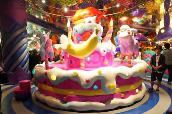进店一看,最吸引眼球的是一个以蛋糕为基座、怪物为马的旋转木马装置。当然,也是彩色的。