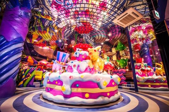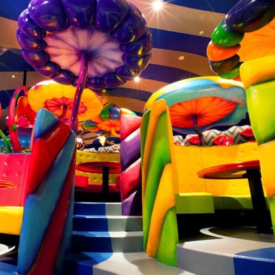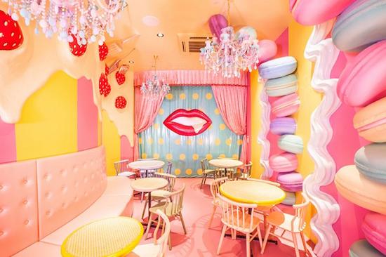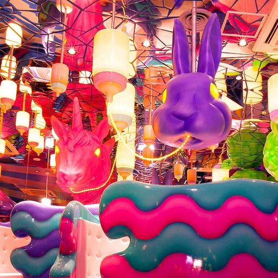 来到就餐区域后,顾客就有了四种选择:可以坐在迷幻毒蘑菇或是卡通动物头下就餐,也可以去马卡龙色的蛋糕空间里喝杯下午茶,还可以去神秘怪异的吧台来杯小酒。