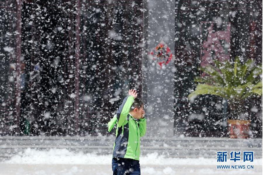4月9日,山东潍坊市民在漫天飞舞的杨絮中出行。随着气温不断攀升,山东潍坊市区不少栽种杨树的地方开始飘“雪”,漫天飞舞的杨絮给人们出行带来不便。 新华社发(张驰 摄)