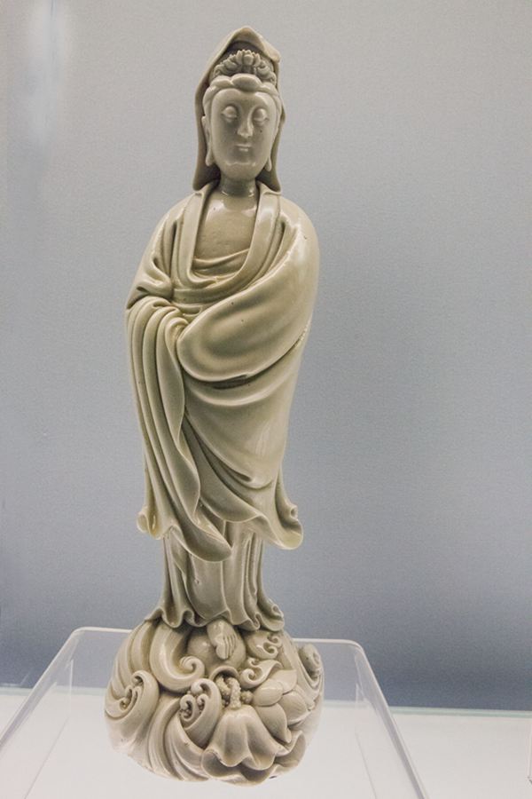 上海博物馆收藏的明德化窑白釉“何朝宗”款观音像(如下图所示),高48厘米。观音头挽高髻,披帔巾,面部丰满圆润,目光向下,表情柔和,体态丰腴,颈戴项圈,上着袒胸广袖褒衣,下着宽腿长裤,两手相拱互置袖中,赤足,立于水波莲花上。衣褶线条柔润,头发丝丝毕现,刻画精细,含蓄端庄,温顺静雅,栩栩如生。背面隐隐约约镌刻有“何朝宗印”。
