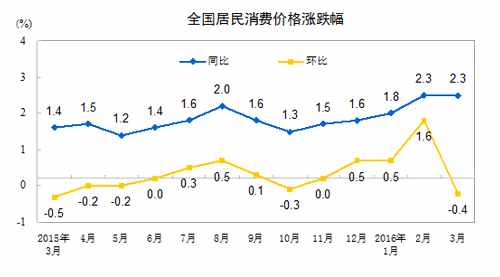 2016年3月份,全国居民消费价格总水平同比上涨2.3%。其中,城市上涨2.3%,农村上涨2.2%;食品价格上涨7.6%,非食品价格上涨1.0%;消费品价格上涨2.5%,服务价格上涨1.9%。1-3月平均,全国居民消费价格总水平比去年同期上涨2.1%。