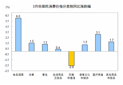 3月份,其他七大类价格同比六涨一降。其中,医疗保健、其他用品和服务、衣着、居住、教育文化和娱乐、生活用品及服务价格分别上涨3.1%、1.7%、1.5%、1.3%、1.2%、0.4%;交通和通信价格下降2.6%。