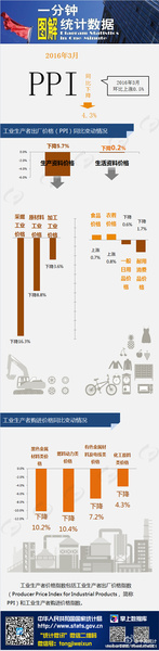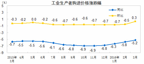 中新网4月11日电 据国家统计局网站消息,国家统计局今日发布的数据显示,2016年3月份,全国工业生产者出厂价格环比上涨0.5%,同比下降4.3%。工业生产者购进价格环比上涨0.3%,同比下降5.2%。1-3月平均,工业生产者出厂价格同比下降4.8%,工业生产者购进价格同比下降5.8%。