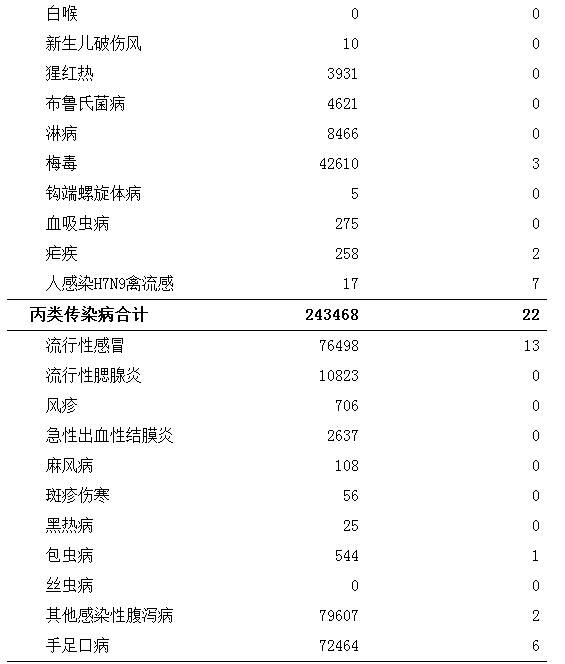 同期,全国共报告丙类传染病发病243468例,死亡22人。其中丝虫病无发病、死亡报告,报告发病数居前3位的病种依次为其他感染性腹泻病、流行性感冒和手足口病,占丙类传染病报告病例总数的94%。