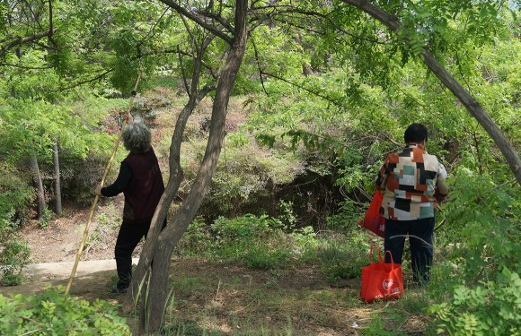 关键词:大妈肆意砍树 摘槐花 河南郑州公园
