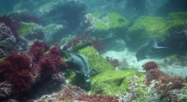 像画面中拍摄的这样,海鬣蜥平日里只吃海藻,而且对于海藻的选择十分挑剔,是一个不折不扣的“素食主义者”,生性温顺。有调查表明,它们可以潜水至九米深。