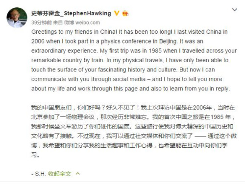 该微博称,“我的中国朋友们,你们好吗?好久不见了!我上次拜访中国是在2006年,当时在北京参加了一场物理会议,那次经历非常难忘。我的首次中国之旅是在1985年,我那时候坐火车游历了你们雄伟的国度。这些旅行使我对博大精深的中国历史和文化略有了接触。不过现在,我可以通过社交媒体和你们交流了 —— 通过这个微博,我希望和你们分享我的生活趣事和工作心得,也希望能在互动中向你们学习。- S.H.”