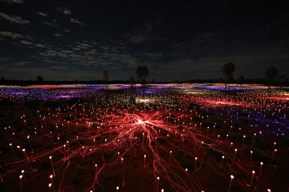 艺术家布鲁斯·芒罗以其灯光艺术作品而闻名。据PBS报道,他最新的作品“光之境(Field of Light)”诞生于澳大利亚内陆沙洲,临近乌卢鲁。
