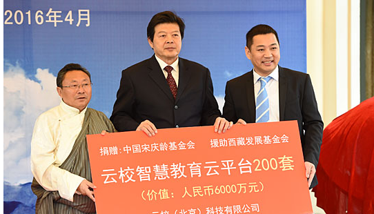 当天的捐赠仪式上,中国宋庆龄基金会常务副主席齐鸣秋和西藏自治区副主席、援助西藏发展基金会秘书长格桑次仁从云校(北京)科技有限公司董事长陈正拜手中接过捐赠牌。