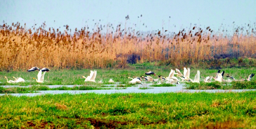 3月的春光洒遍西洞庭湖湿地。在碧波荡漾的湖汊,绿草覆盖的洲滩,或是幽静温润的芦荡,你能见到栖息在这里的黑鹳。这种象征安宁祥和的生灵,或是群集水面嬉戏,激起圈圈涟漪;或是成双腾空欢舞,留下道道倩影。它们少了觅食的艰辛,没有被污染伤害,也远离了遭猎杀的惶惶不安,在这片潇湘水云间,天性和生命得以尽情放飞。
