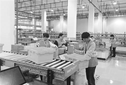 重庆市西部物流园内的跨境电商智能公共监管仓,是园区内的保税仓储处理区,面积约为5000平方米,向电商客户提供保税仓储、落地配送、清关等综合服务。4月13日,工作人员正在分拣打包和扫码收货。经济日报记者 李 景摄