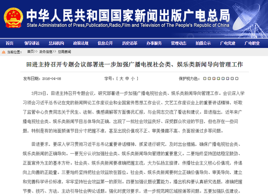3月29日,田进主持召开专题会议,研究部署进一步加强广播电视社会类、娱乐类新闻导向管理工作?;嵋樯钊胙傲旎嵯敖阶苁榧窃诘车男挛庞呗酃ぷ髯富岷腿枷牍ぷ骰嵋?、文艺工作座谈会上的重要讲话精神,听取了监管中心负责同志关于民生、法制、情感调解等方面情况汇报,与会同志交流了看法和建议。田进指出,近年来广播电视社会类、娱乐类新闻节目总体导向正确,出现了一批社会效益良好、深受群众欢迎的节目,但也存在一些问题,特别是有的地面频道节目分寸把握不准,甚至出现价值观不正、审美情趣不高、负面报道过多等问题。