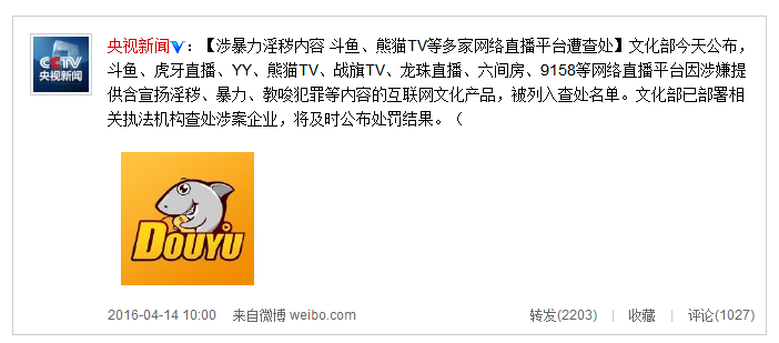 文化部今天公布,斗鱼、虎牙直播、YY、熊猫TV、战旗TV、龙珠直播、六间房、9158等网络直播平台因涉嫌提供含宣扬淫秽、暴力、教唆犯罪等内容的互联网文化产品,被列入查处名单。文化部已部署相关执法机构查处涉案企业,将及时公布处罚结果。(央视记者俞悦)