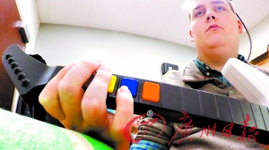 伯克哈特在玩一款基于吉他的电脑游戏。