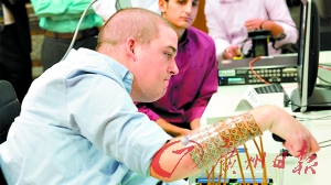 最近,科学家们将一款传感器植入伯克哈特的大脑,以取代他受损的脊椎神经,用来沟通伯克哈特的脑部和手部肌肉。