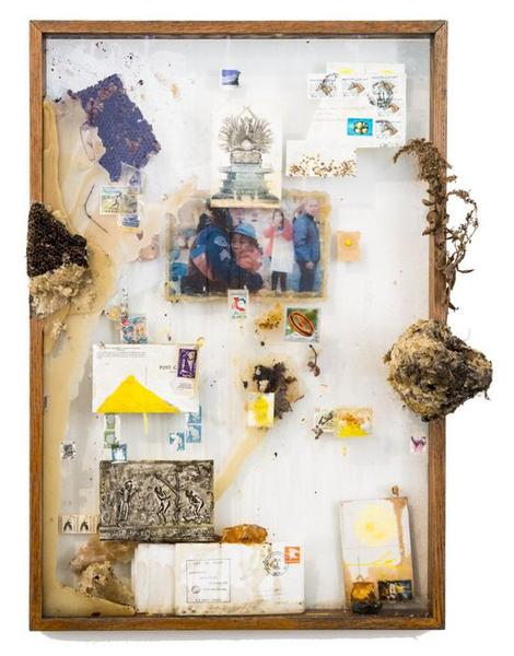 画面当中这个极具约瑟夫·康奈尔(Joseph Cornell)风格的盒子中包括了“来自卡次启尔山脉(catskills)的泥土“、“来自密苏里州弗格森的旧信件”、“来自世界各地冲突区域的邮票“、“在山顶找到的岩石”以及“自然死亡的蜜蜂。“
