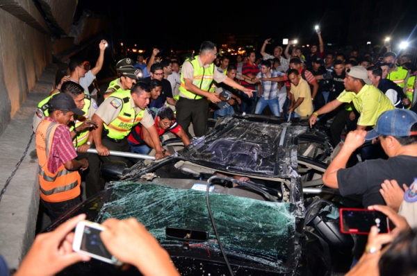 4月16日,在厄瓜多尔第一大城市瓜亚基尔,人们试图救出一名被断桥砸中困在车内的人。
