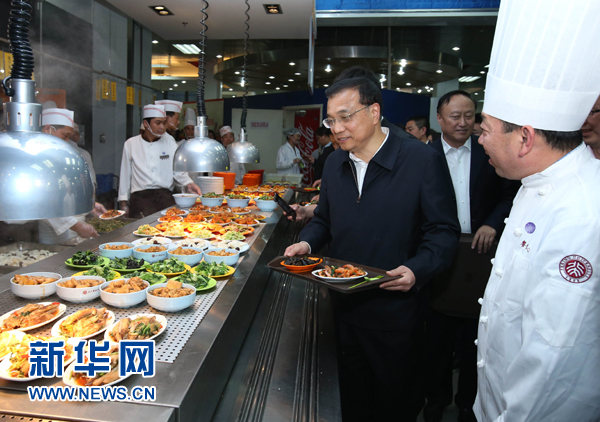 4月15日,中共中央政治局常委、国务院总理李克强到清华大学和北京大学就教育改革发展和实施创新驱动发展战略进行考察。这是李克强在北大学生食堂与学生们一起用餐,了解食堂饭菜价格和学生学习生活情况。 新华社记者庞兴雷摄