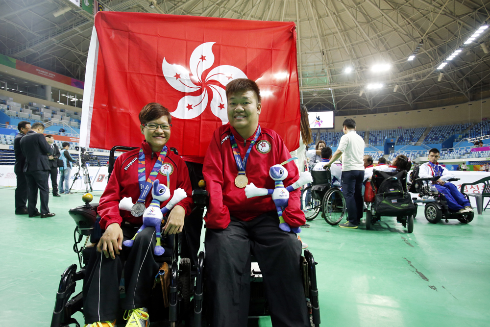 硬地滚球选手梁育荣(右)