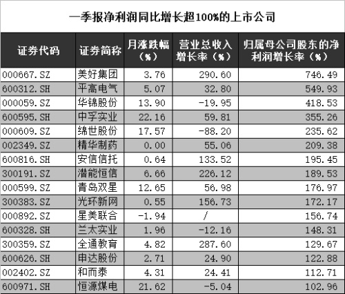 据Wind资讯统计,80家上市公司中,共60家上市公司一季度业绩取得正增长,占比三分之二。美好集团、平高电气、华锦股份、中孚实业等16家上市公司一季度归属母公司股东的净利润实现增长超过一倍的记录。