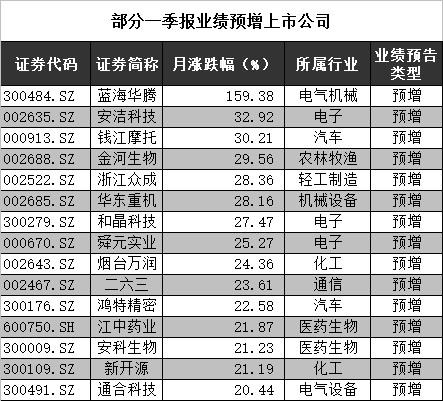 市场表现方面,业绩预增个股中逾六成4月初以来累计涨幅超过大盘。涨幅居前的蓝?;?、安洁科技、钱江摩托、金河生物、浙江众成、华东重机分别上涨了159.38%、32.92%、30.21%、29.56%、28.36%、28.16%,除了华东重机外,其余几家业绩预告变动幅度均超过一倍。
