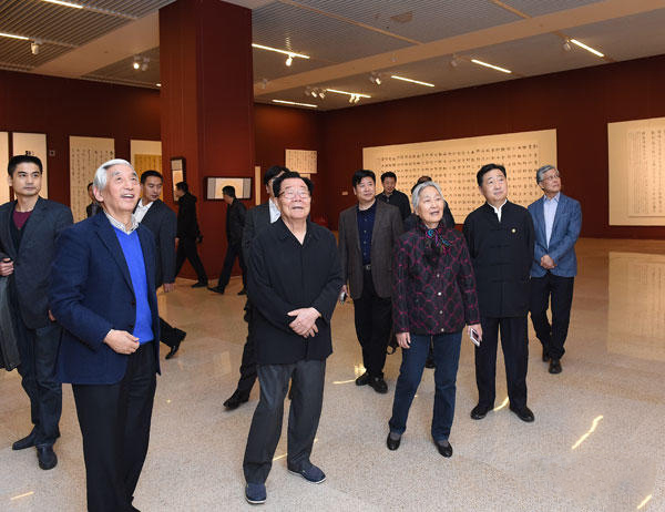 李岚清与参展书画家们交流创作感想,称赞这些展览办的好,能让观众充分感受到中国优秀传统文化的魅力,他希望一定要让更多的中小学生来参观学习。
