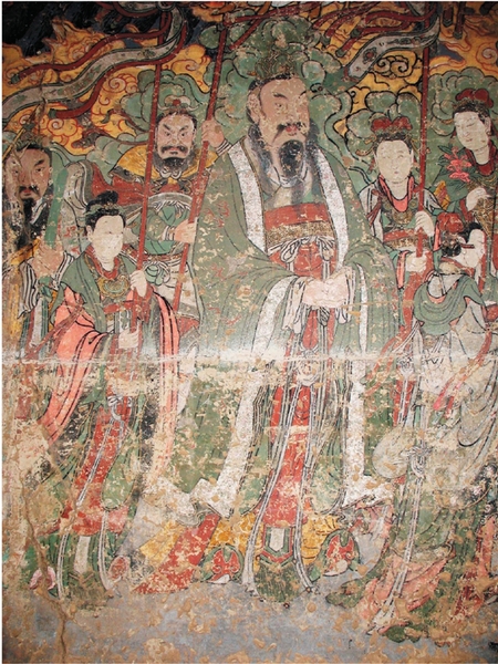 仙翁庙在高平西北的伯方村,仙翁庙古已有之,而仙翁庙壁画却是近年才被发现并引起美术界重视的。仙翁庙是一座道观,庙名源自八仙之一的张果老,壁画绘于 大殿的东、北、西三壁,总面积达130平方米,人物有125个,场面恢宏,结构复杂,北壁中央为张果老像,两侧侍女陪伴,唐朝文武百官毕恭毕敬顶礼膜拜。 东西两壁都是唐玄宗封禅图,以玄宗为中心,主大从小,人物穿插得当,唐玄宗风度翩翩,侍女簇拥,文武官吏相随,西壁玄宗略显消瘦,有风尘仆仆之感,东壁玄 宗神采奕奕,容光焕发,研究者认为这是玄宗两次封禅不同时间,不同体貌的真实表现。据明代《重修总圣仙翁庙碑记》记载:“自唐宋至我朝,其庙感应之灵验, 不计年矣”可知该庙创建应在唐代,现存碑刻题记最早的是在元中期,构件题记最早为元代皇庆二年(1313年),且现在的整体建筑风格为典型元代样式,可知 此庙虽建于唐代,但后世毁于兵火现存建筑应为元代重建,根据壁画不可能早于建筑本体的常识,同时壁画又没有后世改绘的迹象,所以可以确定该壁画为元代作 品。但在绘画风格和处理手法上,它又不像元代的风格,画面的总体气势、吴带当风的衣纹处理、丰腴秀丽的侍女形象、大有唐人遗韵、尤其是人物形象的脸部处 理,明显是唐宋手法,很像中唐的敦煌壁画而不同于元代手法,由此推测,这幅《唐明皇封禅图》很可能是元代画家利用唐宋粉本并沿用唐宋手法绘制的,其艺术价 值应该远超元画,唐张彦远在《历代名画记》中曾记载吴道子在洛阳弘道观画壁画《东封图》以唐玄宗对发迹之地——上党的重视,将吴道子的粉本重绘于仙翁庙也 不是没有可能。