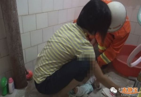 2014年8月14日晚,在桂平市糖厂小区,罗大妈在给 2岁的孙子洗澡时,调皮好动的孙子不慎将脚滑入了便池,结果右脚被死死卡在便池坑里,拔不出来,只好报警求助消防官兵。消防官兵到达现场后,发现小男孩的整个右脚板都没进便池里,轻轻一拉,小男孩就痛得哗哗直哭,加入一些润滑液体也无济于事。