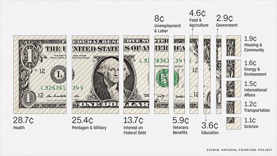 美国政府去年共收到4.2万亿美元税收,非牟利组织国家优先项目把所有支列了一个详细的表。2015年每个家族平均缴了1.3万美元的税。下面就是联邦政府支出明细: