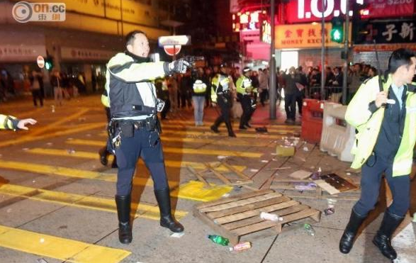 2016年2月9日凌晨,香港旺角山东街与砵兰街交界发生警民冲突,警方一度展示红旗、施放胡椒喷雾,并向示威者挥动警棍控制场面,有示威者向警员投掷杂物,期间有警方朝天开枪警告示威者。