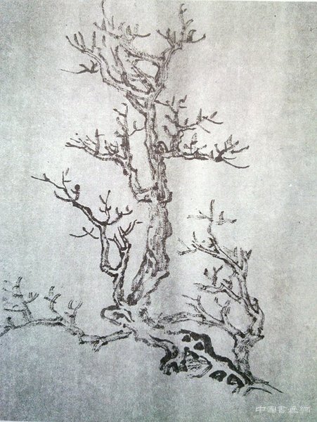 黄宾虹在绘画中常用书法技巧,以增加绘画的内刚和骨气,使欣赏者感到自然力量(如图六)。他曾归纳道:“精通书法者常以书法用于画上,昌硕先生(指吴昌硕, 与齐白石并列为中国近代画坛二位花鸟画大师)深悟此理,我画树枝,常以小篆之法为之?!?/p>