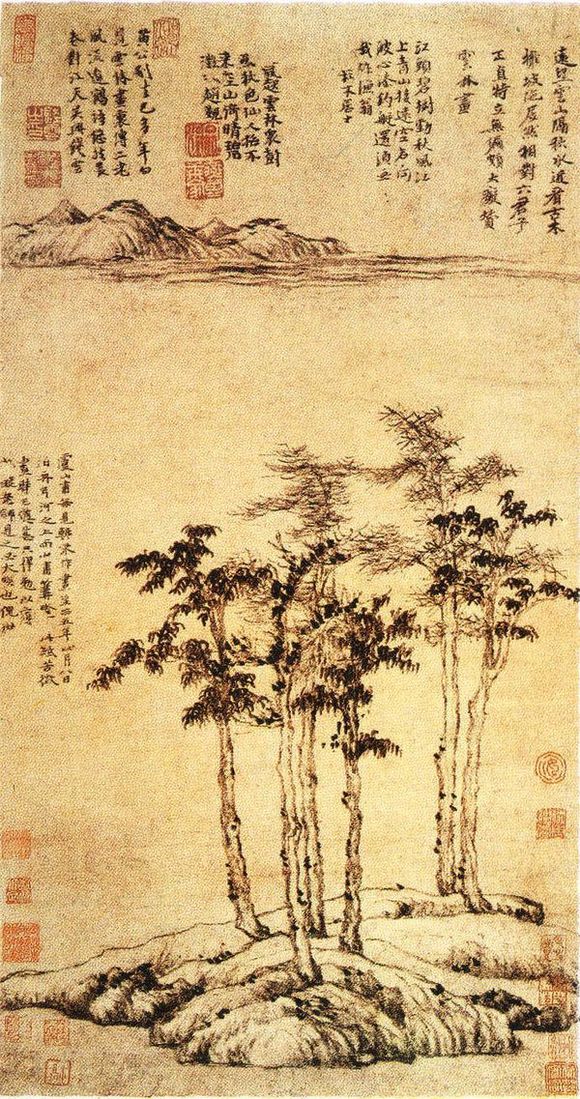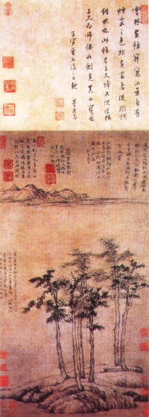 倪瓒以树喻君子,表达了作者对君子“正直特立”高风的崇尚。这正是宋元以来文人绘画借物寓志的一大特色。倪瓒好画墨竹,有人指责他画的竹似麻,似芦,他自解:“余之竹聊写胸中逸气耳,岂复较其似与非?”在《答张藻仲书》中更是明确地阐述:“仆之所谓画者,不过逸笔草草,不求形似,聊以自娱耳?!闭馕抟煨媪宋娜嘶婊淖谥迹阂环矫妫娜私榛馊谌牖?,使绘画不再是现实的简单再现,而是寄托了人们希望的理想世界;而另一方面,文人又将绘画划定为仅供个人娱乐的笔墨游戏。以枯而见润的简练笔墨,营造了湖光山色荒凉空寂的意境:近则秋树稀疏萧瑟,远则山峦绵延横亘,其水面空阔冷清,画上有多人题诗。