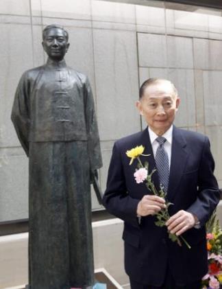 资料图:梅葆玖在梅兰芳雕像前献花。中新社发 杜洋 摄