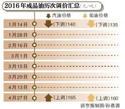 新京报讯 (记者赵毅波)国家发改委4月26日下午公布,自2016年4月26日24时起,国内汽、柴油价格(标准品,下同)每吨分别提高165元和160元。这是今年以来国家首次上调成品油价格。此前由于国际油价低迷,国内成品油价格上调已经连续六轮搁浅。
