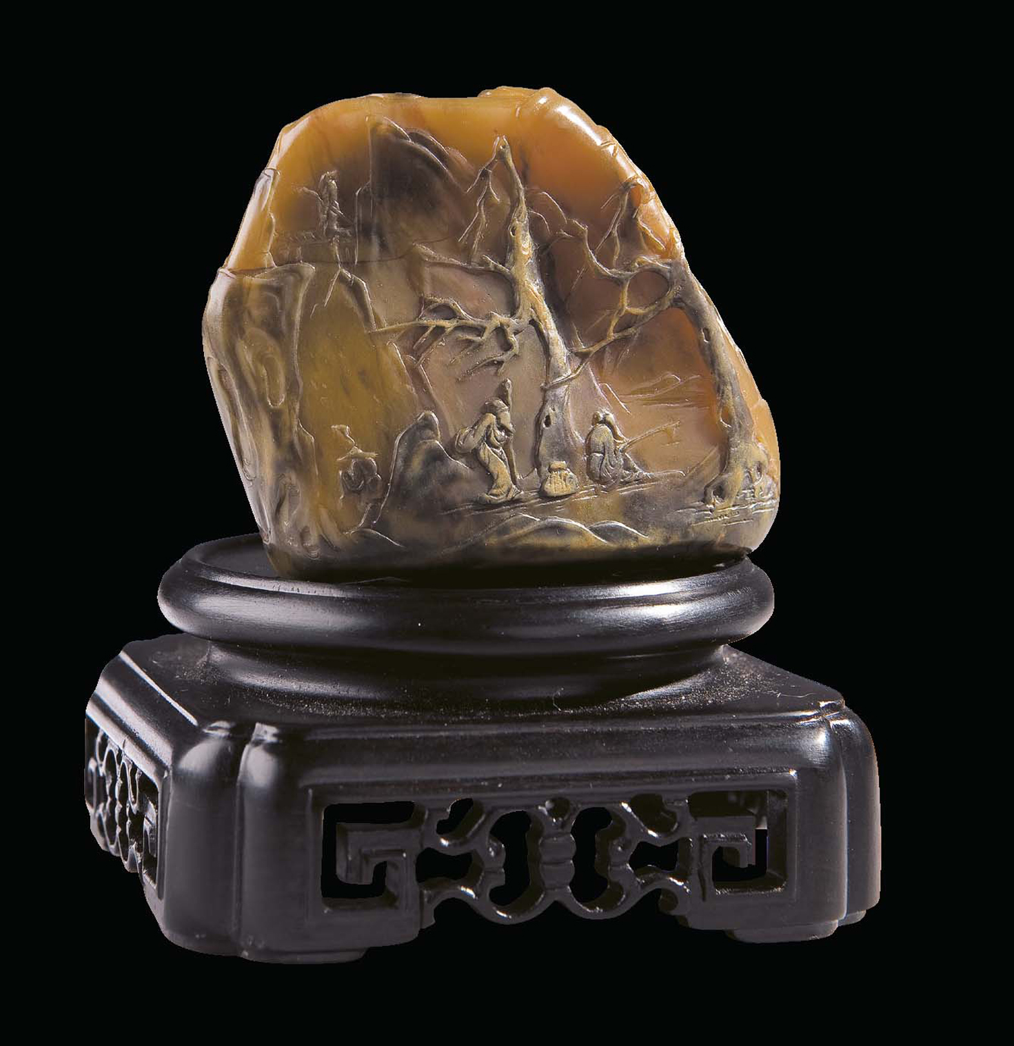 笔者收藏有一块清代的乌鸦皮田黄石摆件,它长8.8厘米、宽5.3厘米、厚2.3厘米。它颜色深红,神似玛瑙,正是田黄石水坑石的一种——玛瑙冻,因其光彩灿烂,流光溢彩,和宝石中的玛瑙类似,故名。上面的乌鸦皮,被雕刻成意境淡远的山水图,一边之上,远山静默,青松苍翠,亭台掩映,楼阁高耸,一缕翠烟袅袅升起,与天上的流云连成一片,宛如一幅泼墨山水,氤氤氲氲,浓浓淡淡,都入了暮色,夕阳晚霞,殷红一片。另一边同样是山间美景,不过却多出几个人物,只见山石嶙峋,小径出入,一棵青松宛如华盖,直将山石人物都囊括在它的怀抱里。树下是五位老者,一个垂钓,一个拄仗前行,两人对弈,另一人观棋不语,颇有得色,看来棋盘走向已经了然于胸。这当是我国绘画之中颇为常见的《五老图》。