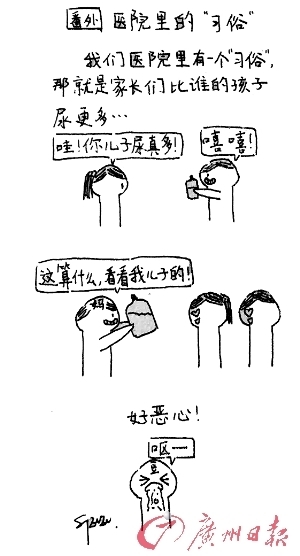 如今,豆豆的漫画仍在微信公众号“太阳花亲子驿站”连载。在一幅《医院里的“习俗”》的漫画中,“比尿多”竟成为医院习俗,让人觉得搞笑的同时却又觉得有些奇怪。