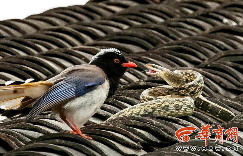由于蛇的体型较大,且颇为凶猛,几分钟后这只红嘴蓝鹊渐渐体力不支,双方一时间处在了对峙状态。 陈浩 摄