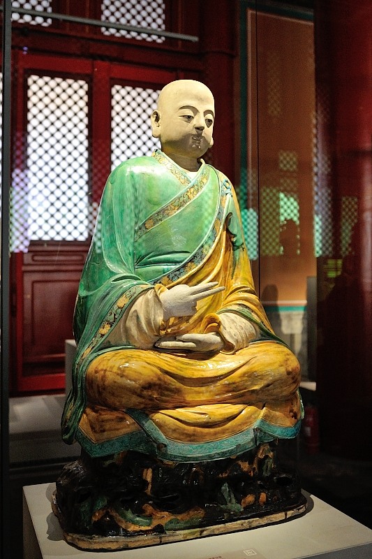 大佛堂展示的佛教造像分成两个部分,其中明间展示的是不同时期、不同材质从而呈现不同艺术风格的佛教造像70尊,如西晋的青瓷佛像,北魏的泥塑彩绘供养菩萨像,唐代的善业泥、石比丘像,宋、辽、金、明、清各代的木雕佛、菩萨、罗汉像,明代夹纻佛像,明清德化窑白瓷塑像,以及清宫旧藏的寿山石十八罗汉像等,充分显示出故宫博物院在佛教造像文物收藏方面的全面与丰富多彩。大佛堂东暖阁展示的是金铜质地的佛教造像74尊,始自十六国时期,讫于清代,分为汉地佛教造像和藏传佛教造像两类,精品迭出。尤为值得关注的有十六国时期的铜菩萨像、南朝梁大同三年的僧成造铜弥勒佛像、唐代铜鎏金卢舍那佛像、大理国铜鎏金千手千眼观音像、明代石叟制作的各类铜像,以及明代永乐、宣德款的宫廷金铜造像等。