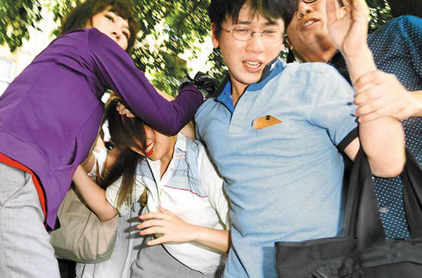2014年6月4日,被曝结婚仅19天就不伦劈腿的女艺人弯弯(胡家玮),中午由出版社社长陪同出面鞠躬致歉,下午如期出席代言活动。活动上,面对记者提问,她始终冷处理对出轨闭口不谈。见到大批媒体拍摄,弯弯拔腿就跑,现场爆发激烈推挤冲突。(资料图)