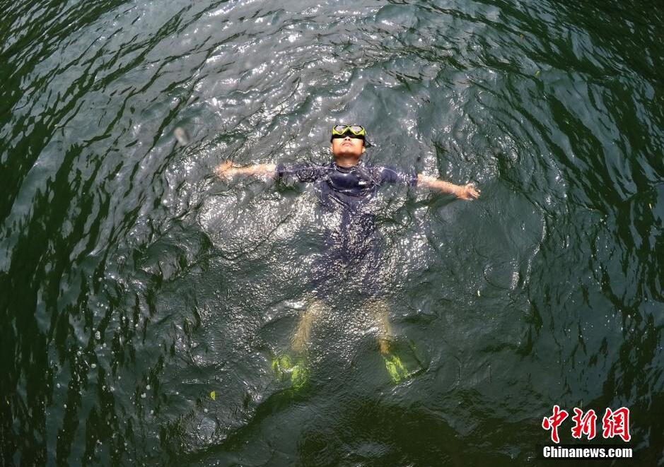 潜水捡垃圾耗费体力巨大,高健利用工作间隙漂浮在湖面上休息。 杨华峰 摄