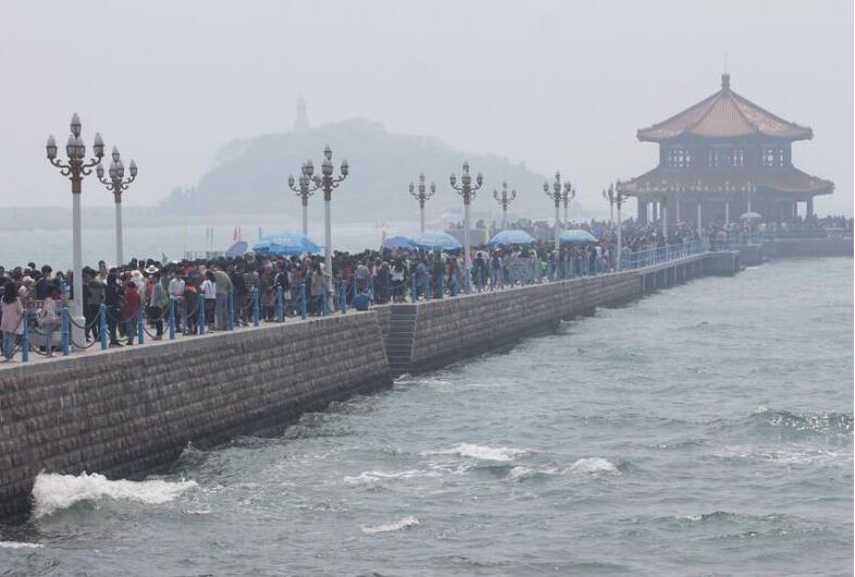 4月30日消息,“五一”小长假首日,各大旅游景点迎来数量众多的游客。图为山东省青岛市,栈桥风景区游人爆棚。当日,数十万游客来到青岛海滨亲近大海休闲度假,青岛各大风景区游人如织,栈桥人挤人几成人桥。