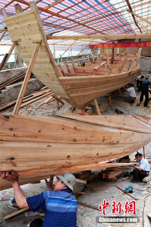 2013年5月7日,在福州市中国十大历史文化名街三坊七巷福船文化馆,来自福建福鼎的郑师傅和65岁的老船匠黄师傅正对最后一块船板进行加工。福建的福船与广船、沙船、鸟船并列为中国古代四大船系,其中“水密横舱壁”这项技术就是在福船上最先采用和发明的。随着工业化进程的加快,现在建造的大多使用铁壳船舶,木质船几乎没有了市场。而且,造船是个慢工活,比较辛苦,年轻人不爱学,木质造船业面临生存与传承两大?;?。2010年,福船制造技艺被联合国教科文组织列入“急需保护的非物质文化遗产名录”。(拼版图片)(资料图片)中新社记者 张斌 摄