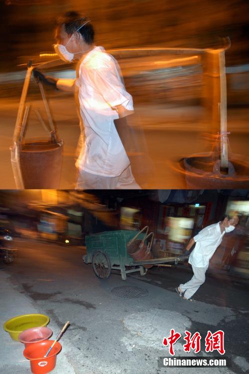 每天傍晚六点左右,刘师傅拉着粪桶车,清理小巷居民的马桶。这工作刘师傅做了将近三十年。随着现代社会的发展,越来越先进的卫浴设施齐备,马桶渐渐退出了属于它的时代。在福州一些老城区,由于不少建筑属于?;ば灾?,不能拆建改造,加之房屋之间相当拥挤,根本无法安装现代卫浴设施,所以在这里的居民至今还沿袭使用马桶的习惯。因而,在如今高楼林立、车水马龙的繁华都市里,还有着这样一群人,他们默默穿行在胡同小巷中,推着粪桶车,清理小巷居民的马桶。但是,随着旧城区改造的推进、老房子的拆除重建,福州清粪工也渐渐消失在民众的视线中。(拼版图片)(资料图片) 中新社记者 张斌 摄