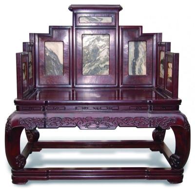 血檀主要用于仿古家具制作,图为血檀镶石纹书卷宝座。