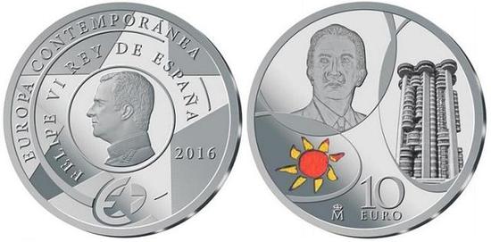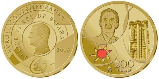 纪念币有金币和银币两种,但两种均采用同样的设计。背面是萨尔瓦多·达利(SalVador Dalí)的肖像,他是著名的西班牙超现实主义画家,还有著名的建筑物马德里的“白塔”和一个彩色的太阳标志。而正面则是欧罗巴系列的共同正面图案,西班牙则添加了其费利佩国王的侧面肖像。