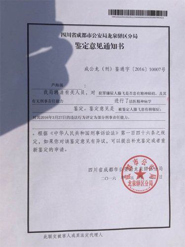 5月4日上午,成都龙泉驿公安分局民警,向四川师范大学杀室友事件被害人家属,告知了嫌疑人精神鉴定结果。根据警方出具的鉴定意见通知书,嫌疑人滕刚(化名)的法医精神病学鉴定意见是:患有抑郁症;对其3月27日的违法行为评定为部分刑事责任能力。